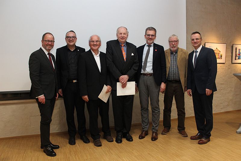 Die Lemgoer Sternheimnadel für ihren ehrenamtlichen Einsatz erhielten in diesem Jahr Wilfried Waibel und Wolfgang Reker und wurden dafür herzlich beglückwünscht. (von links) Verbandsvorsteher Jörg Düning-Gast, Bürgermeister Markus Baier, Preisträger Wilfried Waibel, Preisträger Wolfgang Reker, Sparkassen-Vorstandsvorsitzender Klaus Drücker, Laudator Jürgen Meyer und Laudator Roman Paschek. (Foto: Alte Hansestadt Lemgo)